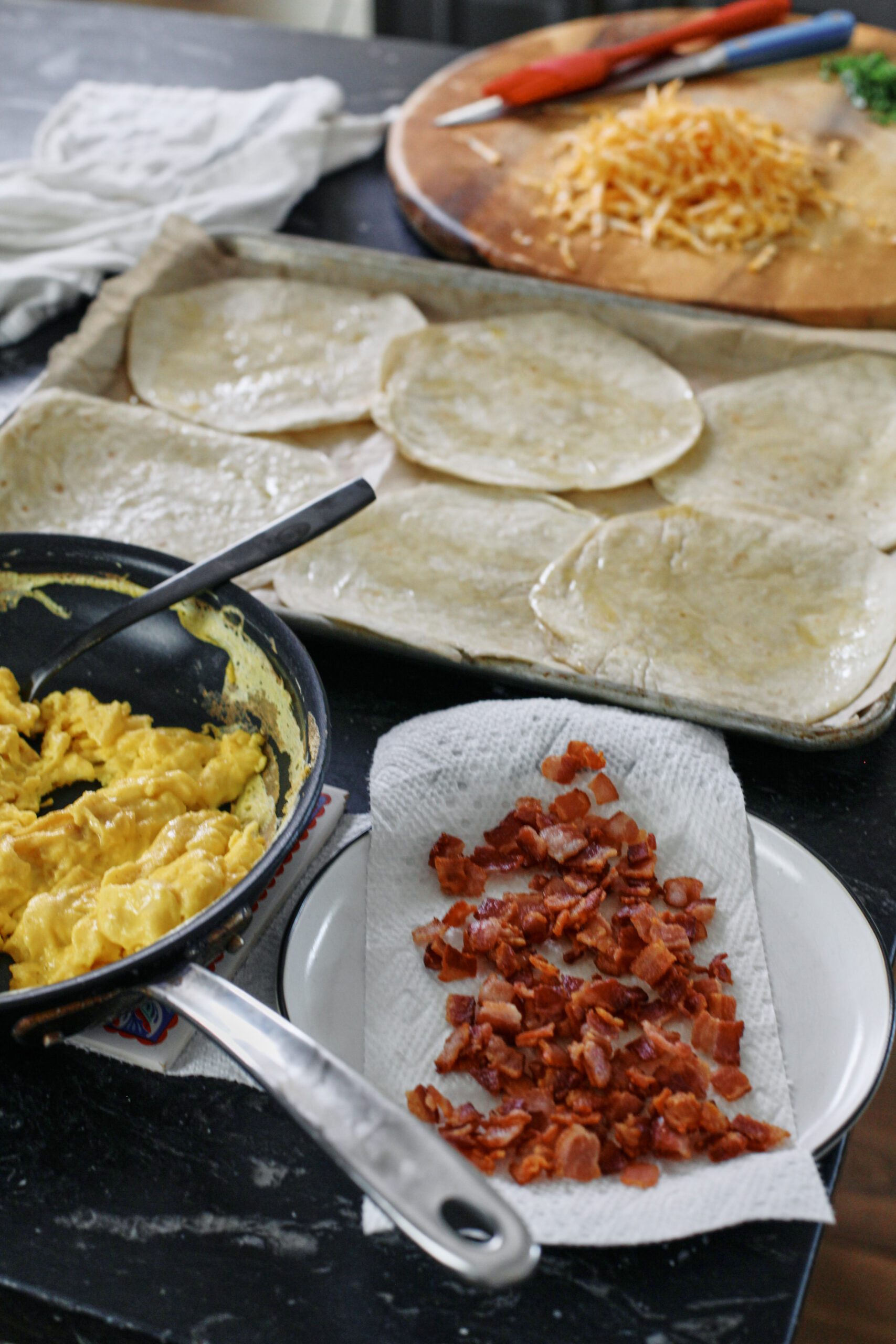 - On one half of each tortilla, layer: a bit of cheese, scrambled eggs, green onion, crispy bacon, and another sprinkle of cheese.