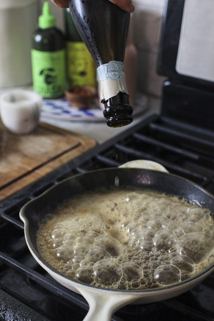 - Deglaze with champagne, raise the heat to medium-high, and stir as the golden bits from the bottom of the pan will release. Let this reduce for about 10 minutes (or try the nose test: if you feel a burning sensation in your nose when smelling the sauce then keep cooking since the alcohol hasn’t fully cooked off yet). It should be reduced by half.
