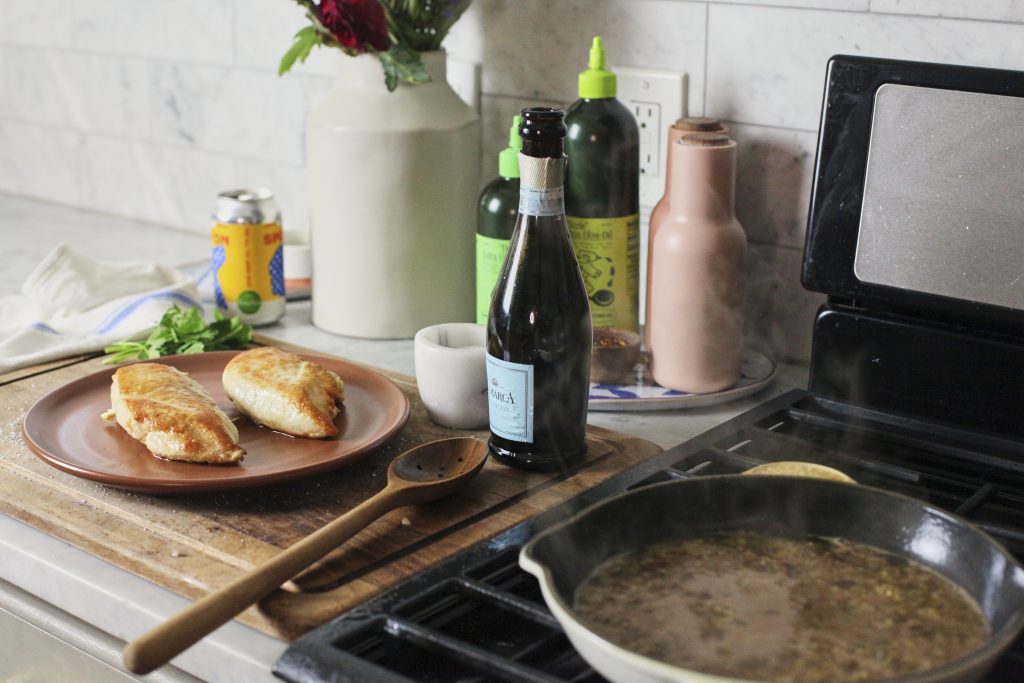 You can really use anything here (sparkling white wine, brut, etc) but just make sure it’s on the dry side and not super sweet. It doesn’t have to break the bank. I actually used a smaller (375 ml) bottle that I had on hand! Sidebar, we actually bought this bottle to bring to the hospital after I delivered my son but never ended up drinking it! So when I wanted to create a recipe for this Champagne Chicken I was THRILLED to find this bottle laying around. You can also use half of a full size bottle of champagne and then save the rest to enjoy with the meal!