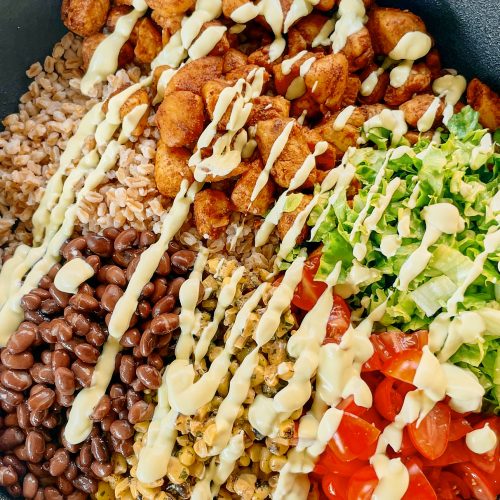Say goodbye to boring meal prep: introducing this super healthy and flavorful spiced chicken burrito bowl that is absolutely PACKED with protein! This is also really simple to make so it’s a great option if you have a lot going on but want to ensure you have healthy and delicious food on hand! The spice blend for the chicken is incredibly tasty, and the avocado lime crema adds the perfect freshness to tie the whole dish together.