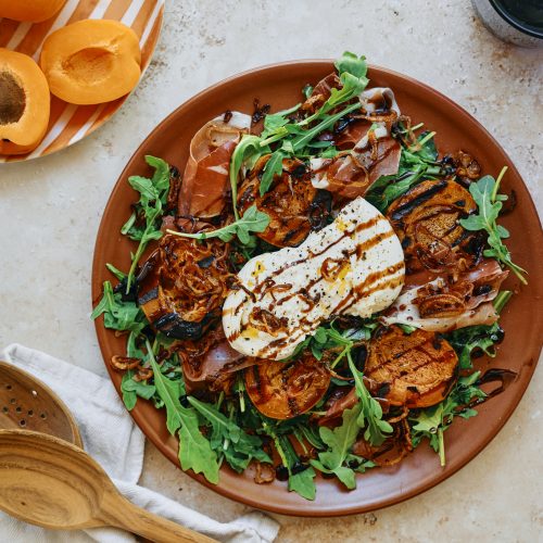 This is one of those salads that checks all of the boxes for me. You have a slight sweetness from the caramelized grilled apricots, a peppery and fresh bite with the arugula, saltiness from the prosciutto, creaminess from the burrata, a savory crunch from the crispy shallots, and then olive oil and a balsamic glaze tie it all together.