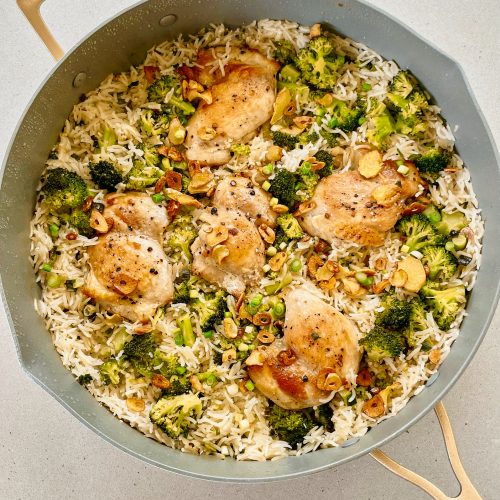 • Reduce heat to a simmer, add chopped broccoli and the chicken thighs, cover and let cook for 15-20 minutes (or until rice has absorbed all of the liquid and chicken is cooked through).