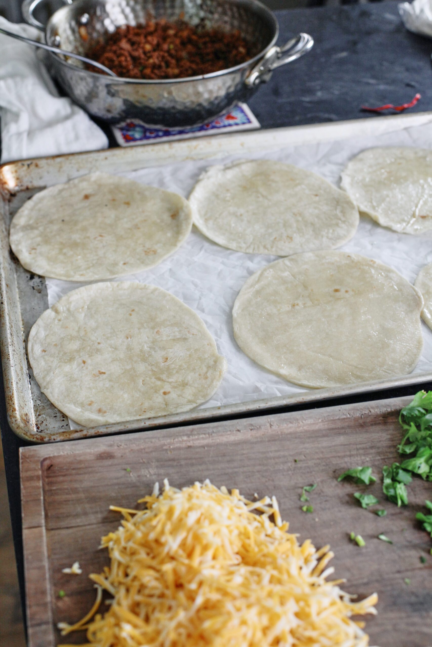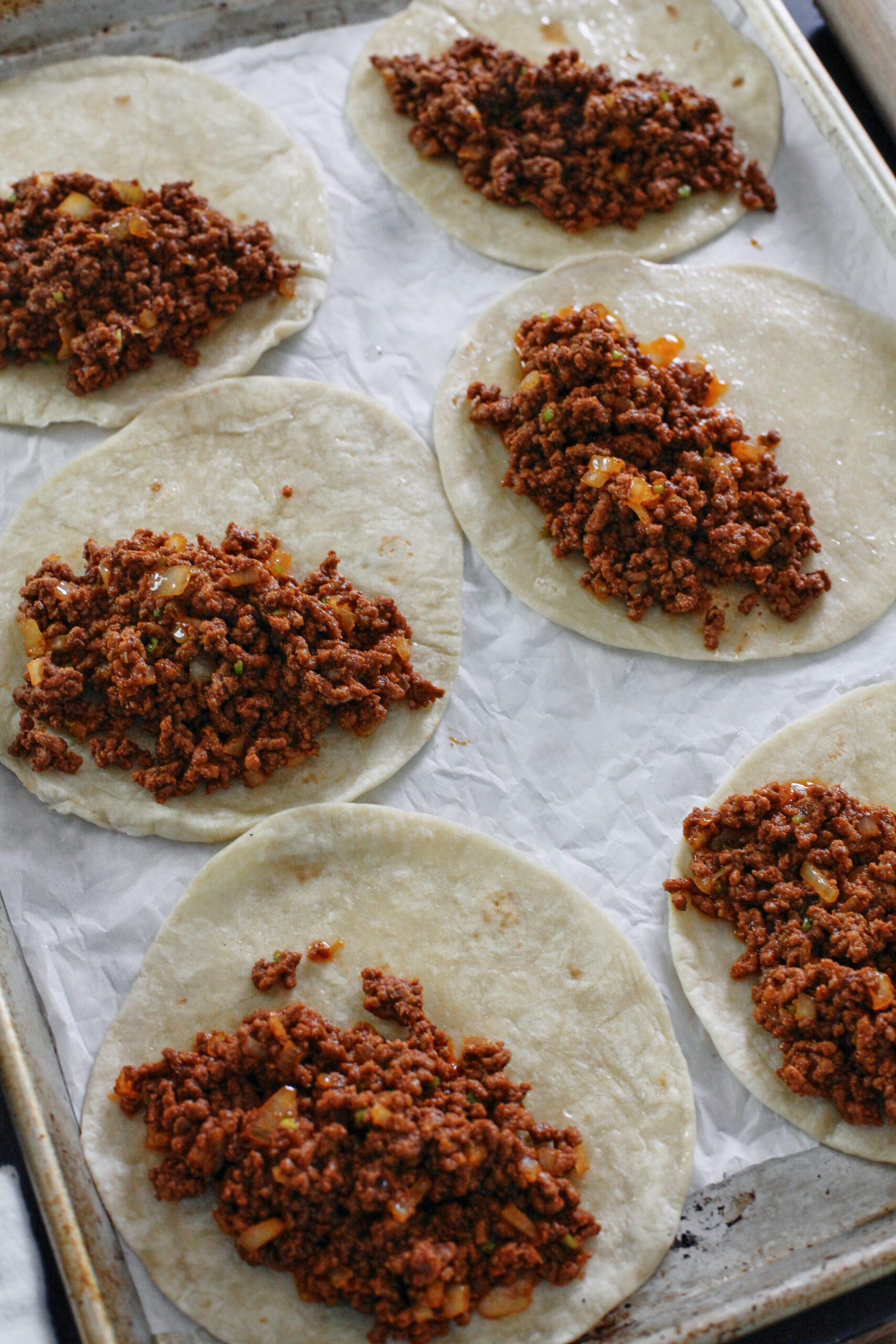 On a baking sheet lined with parchment paper, place the tortillas and brush on each side with olive oil. Add seasoned ground beef (with a slotted spoon so you don’t transfer over any of the excess oil) to half of the tortilla.