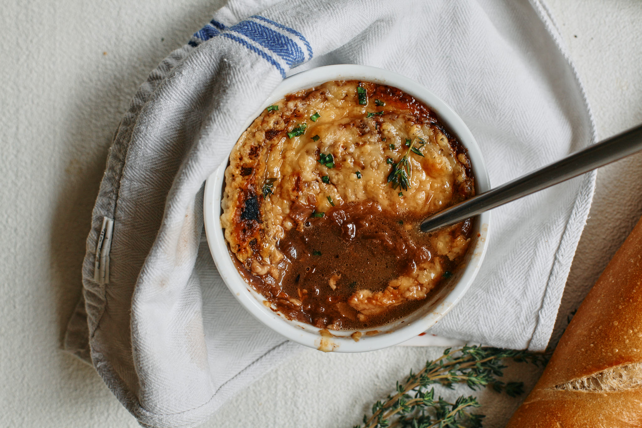 This cozy and comforting classic is made with red onions instead of yellow onions and the result is a more complex, more deeply caramelized flavour. It’s deglazed with some red wine to deepen the flavour even further! Finally it’s topped with buttery crispy bread and lots of gruyere cheese that gets bubbly and golden under the broiler.