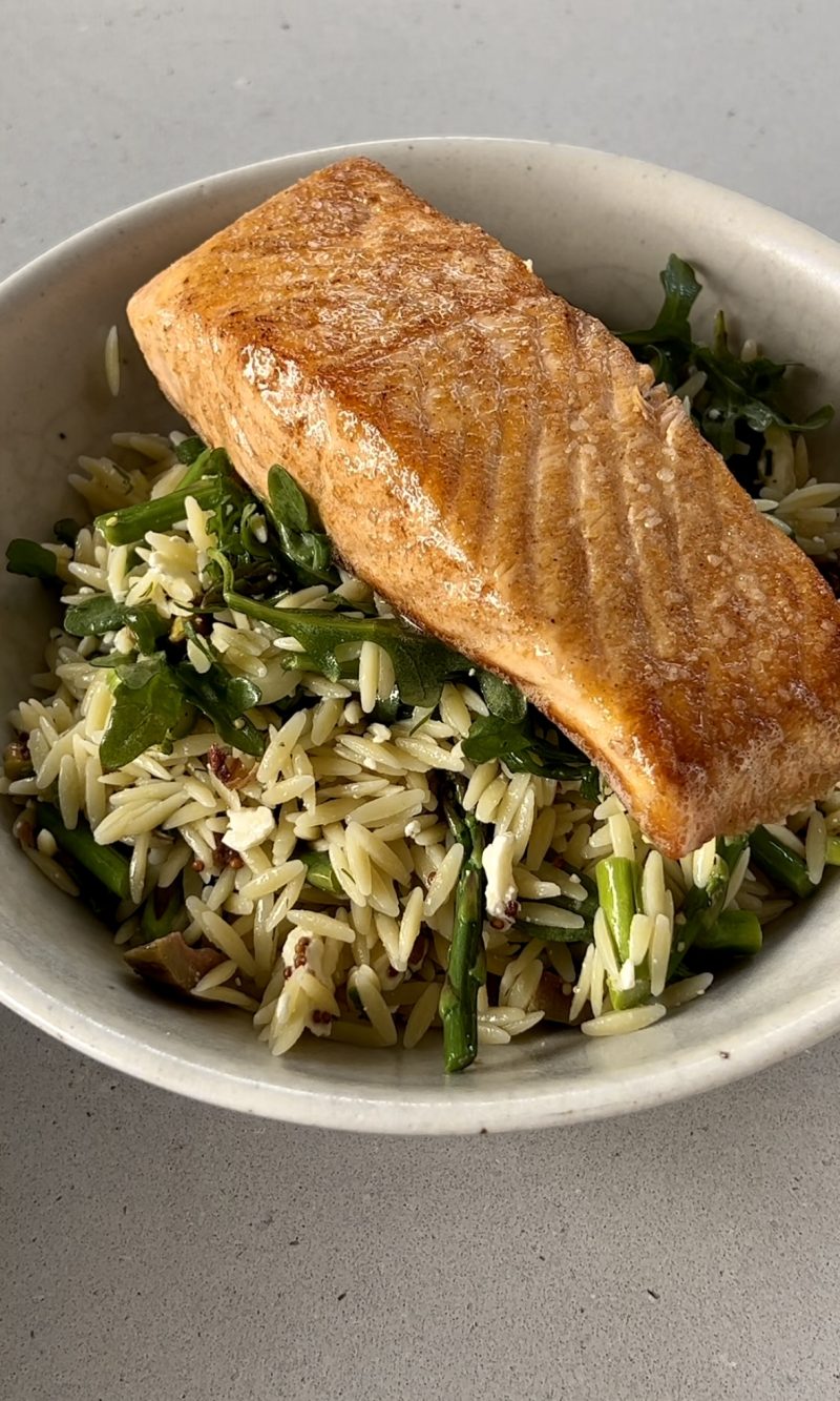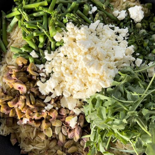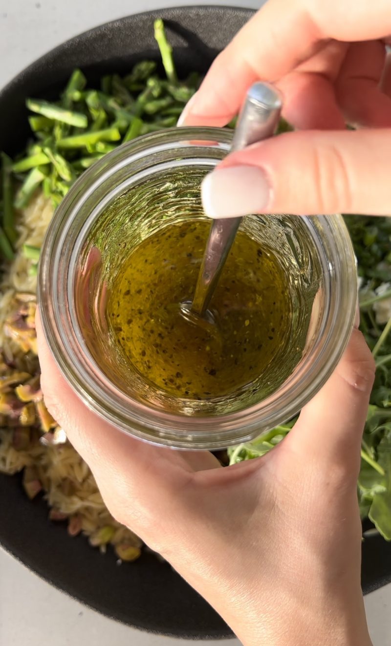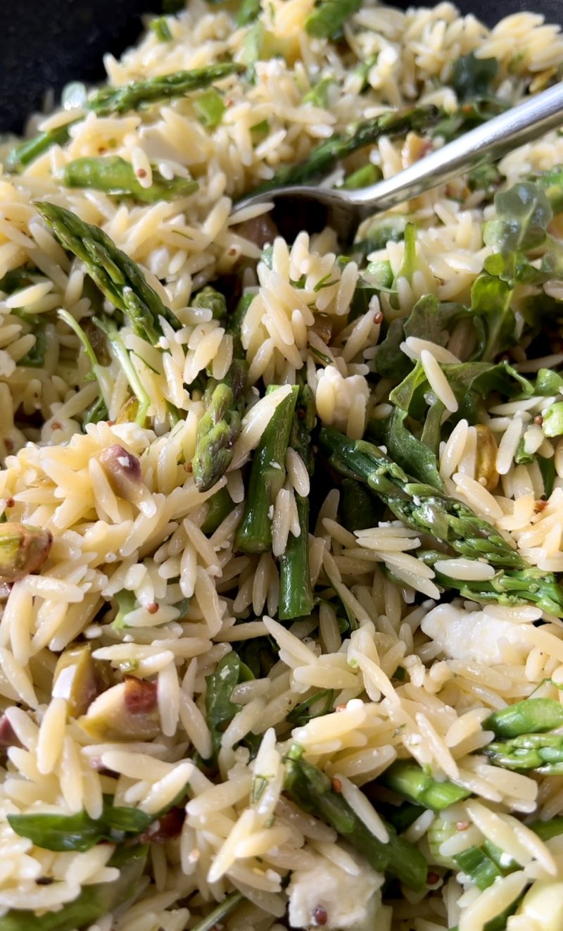 • Assemble: orzo, chopped asparagus, chopped herbs, handful of arugula, pistachios, olives, and crumbled feta. Drizzle the lemon vinaigrette on top and mix! Top with optional protein.